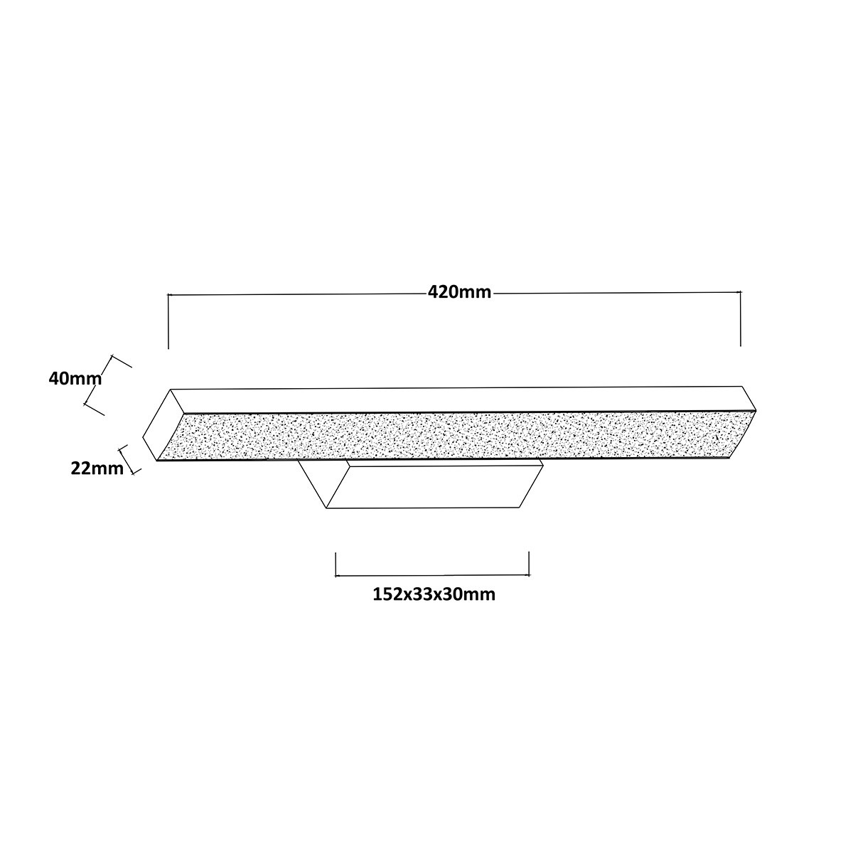 Wymiary: Długość kinkietu wynosi 42 cm, szerokość 4 cm, głębokość 2,2 cm. Długość podsufitki wynosi 15,2 cm, szerokość 3,3 cm, głębokość 3 cm.