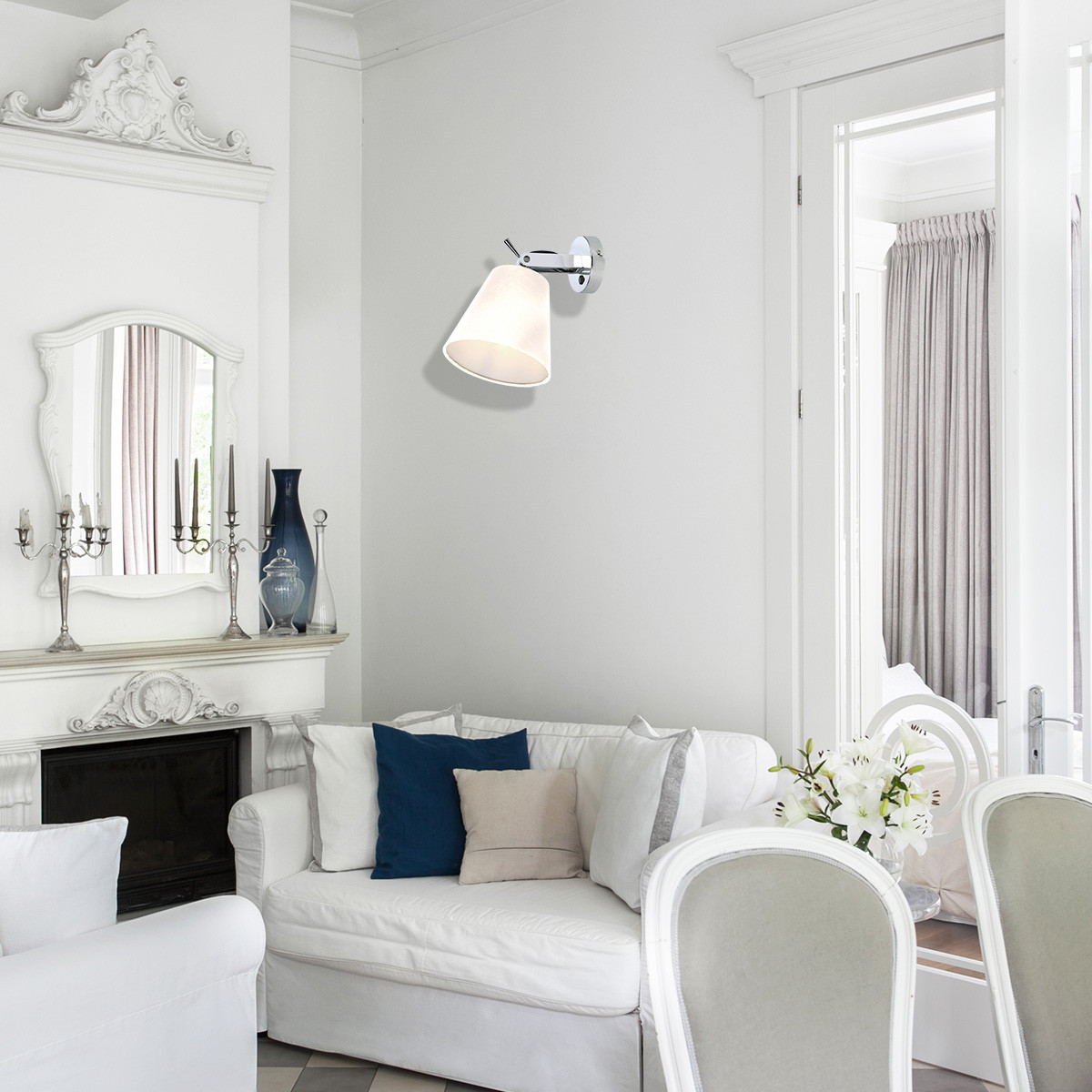 Materiał i kolorystyka: Kinkiet został wykonany z metalu w srebrnym kolorze i klosza z białej tkaniny.