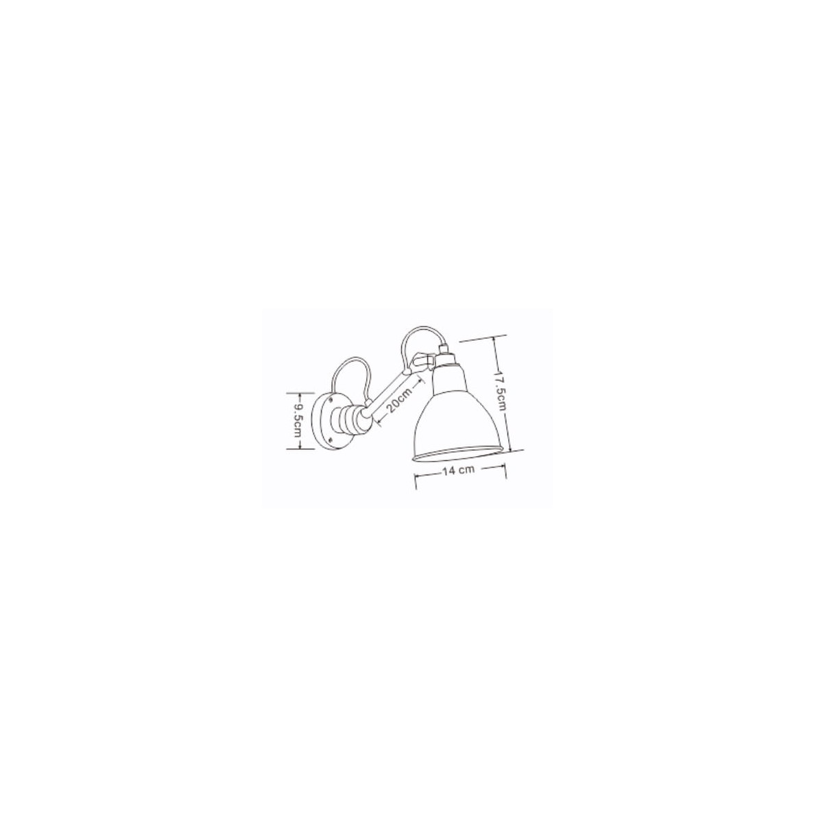 Wymiary: Średnica klosza wynosi 14 cm, wysokość natomiast 17,5 cm. Długość całego kinkietu wynosi około 40 cm (patrz rysunek techniczny).