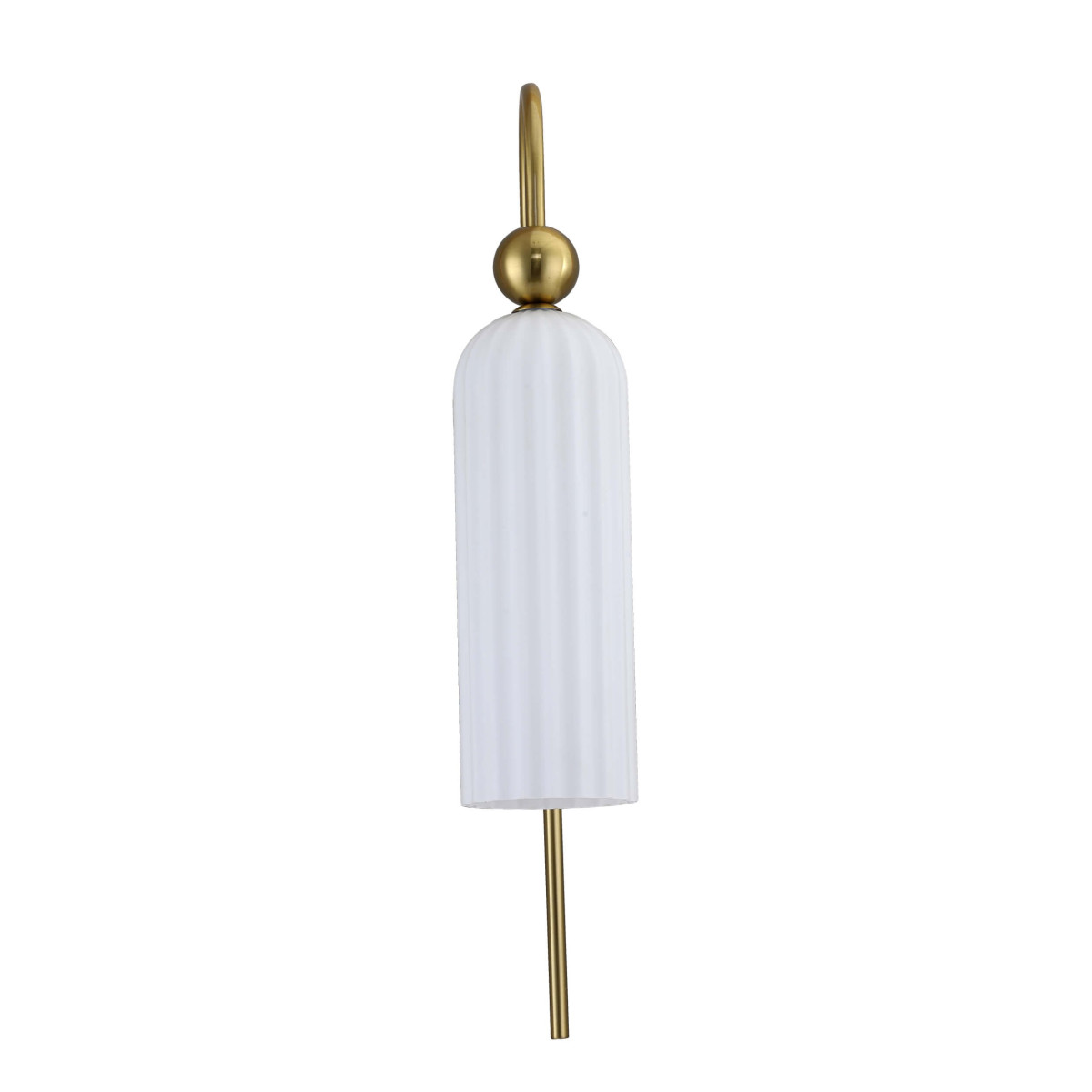 Materiał i kolorystyka: Kinkiet został wykonany z metalu w kolorze złota oraz szkła w białym kolorze.
