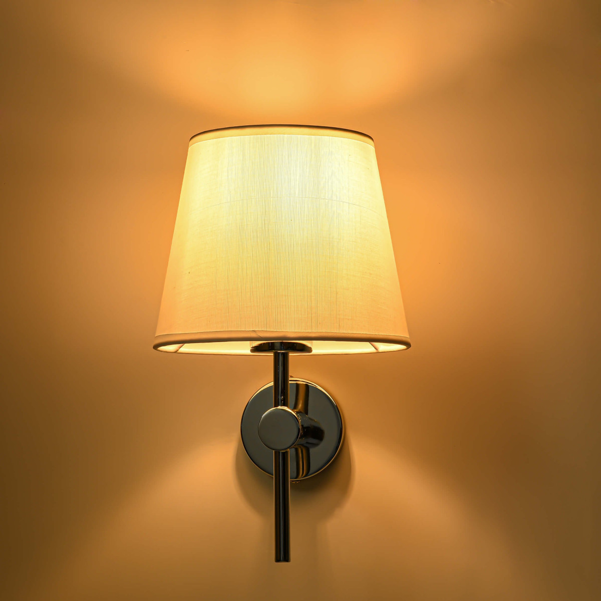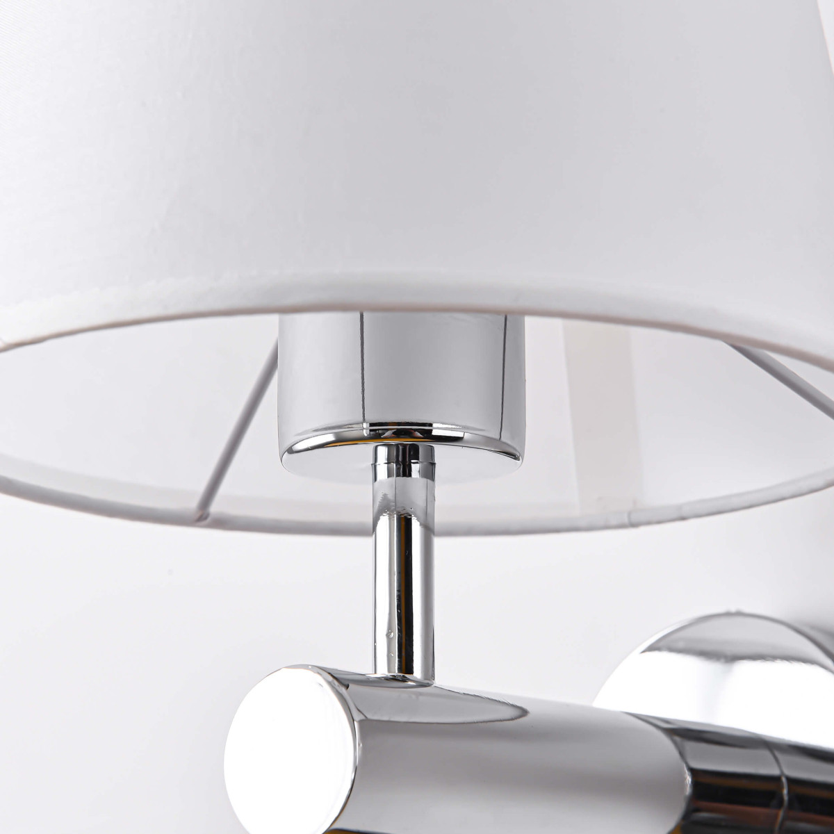 Materiał i kolor: Konstrukcja kinkietu wykonana jest z metalu w kolorze chromu, abażur z eleganckiej białej tkaniny.