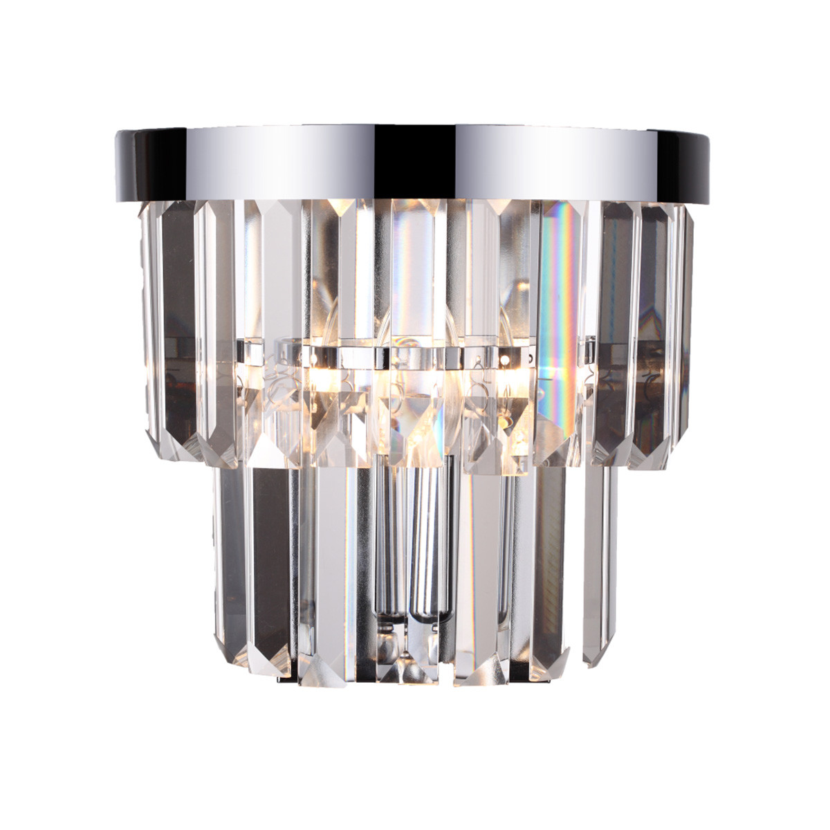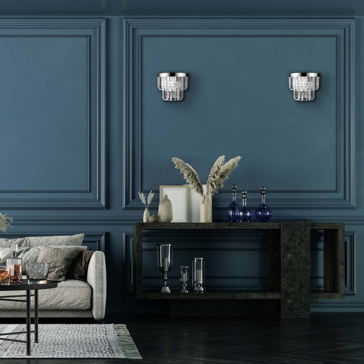 Kinkiet z kolekcji Vetro to wyrafinowane połączenie metalowej konstrukcji w srebrnym kolorze z transparentnym szkłem o efektownym wykończeniu. Jego kształt i materiały czynią go idealnym wyborem do pomieszczeń urządzonych w stylu glamour.