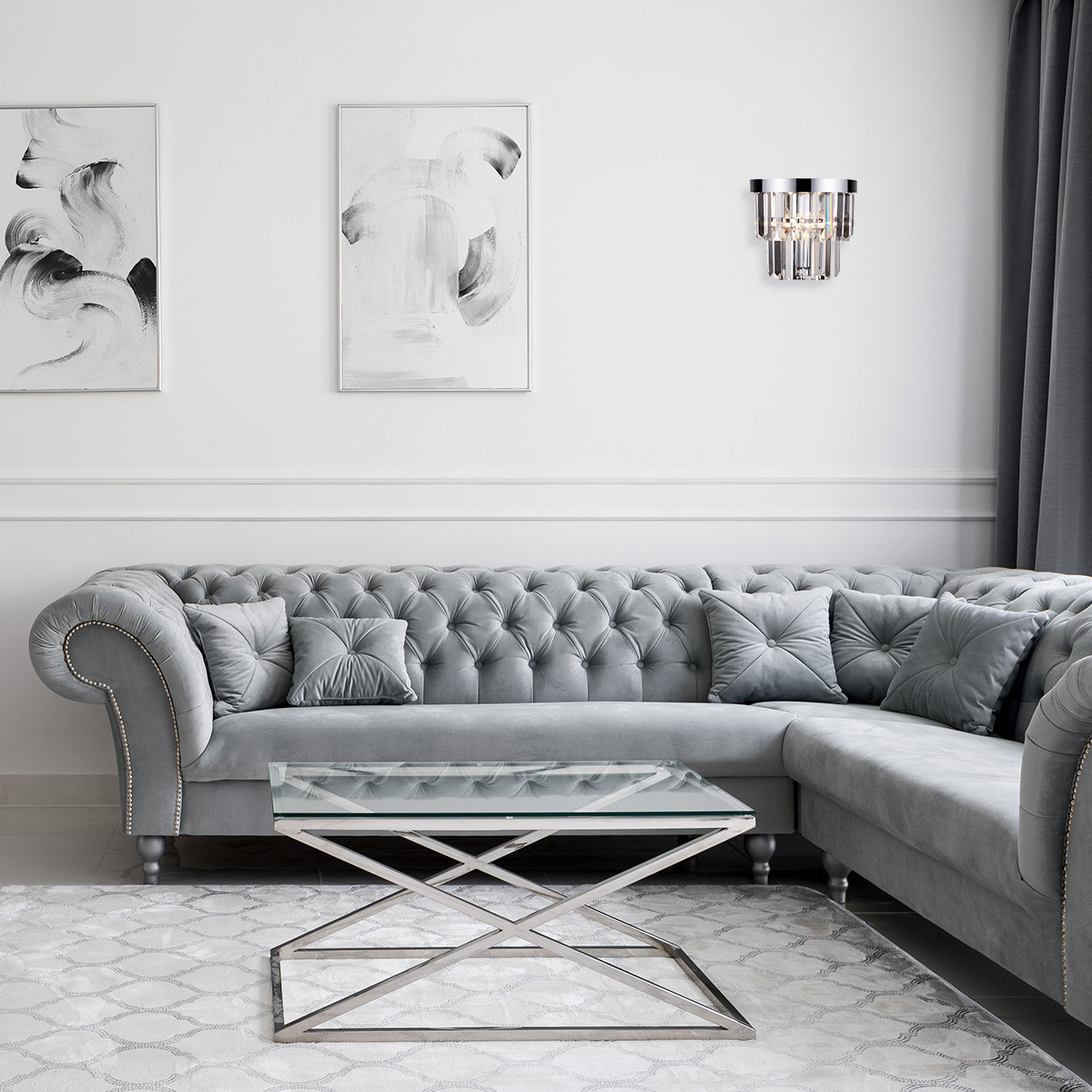 Kinkiet Vetro to doskonały przykład oświetlenia w stylu glamour. Jego konstrukcja została wykonana z metalu o delikatnym srebrnym wykończeniu, idealnie współgrającego z kloszem ze szkła imitującego kryształki. Ta harmonijna kombinacja materiałów nadaje kinkietowi niezwykłego blasku i luksusowego wyglądu. Szklane kryształki są doskonałym materiałem odbijającym światło, co dodatkowo podkreśla elegancję tego modelu. Kinkiet Vetro nie tylko pełni funkcję oświetleniową, ale również stanowi wyrazisty element dekoracyjny, wprowadzając do pomieszczenia nutę luksusu i stylu. Doskonale komponuje się z eleganckimi i nowoczesnymi wnętrzami, dodając im niepowtarzalnego charakteru. Kinkiet jest doskonałym uzupełnieniem całej kolekcji lamp Vetro.