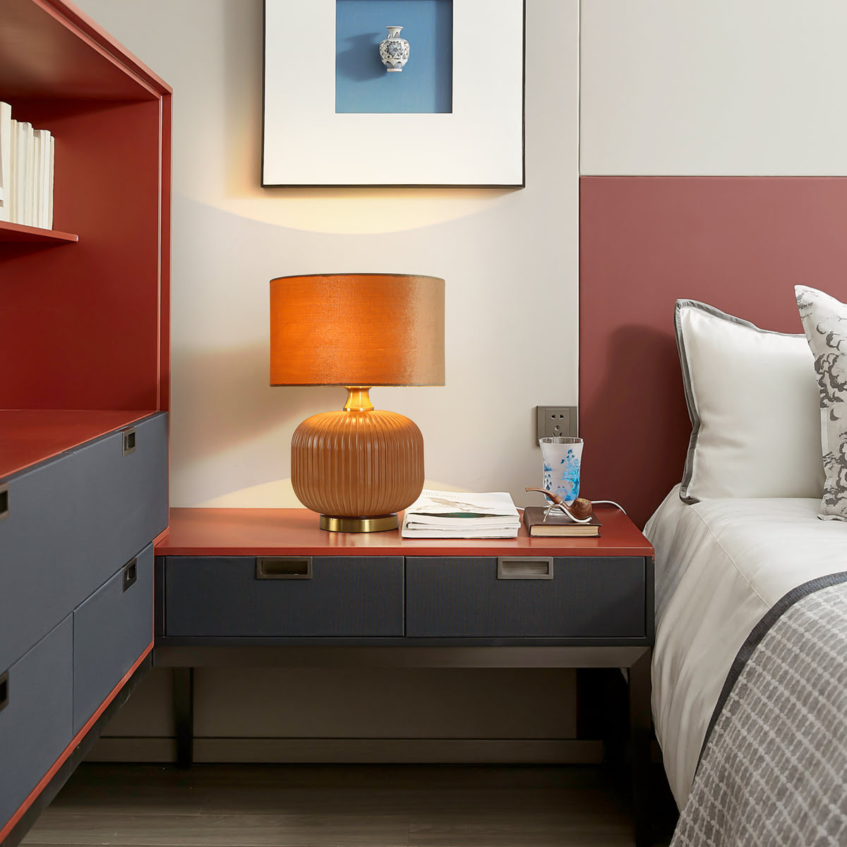 Mała lampa na stolik nocny generuje ciepłe, nastrojowe światło, które sprzyja odpoczynkowi po ciężkim dniu. Gdy jest włączona i światło przesącza się przez klosz, złote drobinki mienią się subtelnie, podkreślając dekoracyjny charakter tego dekoracyjnego obiektu.
