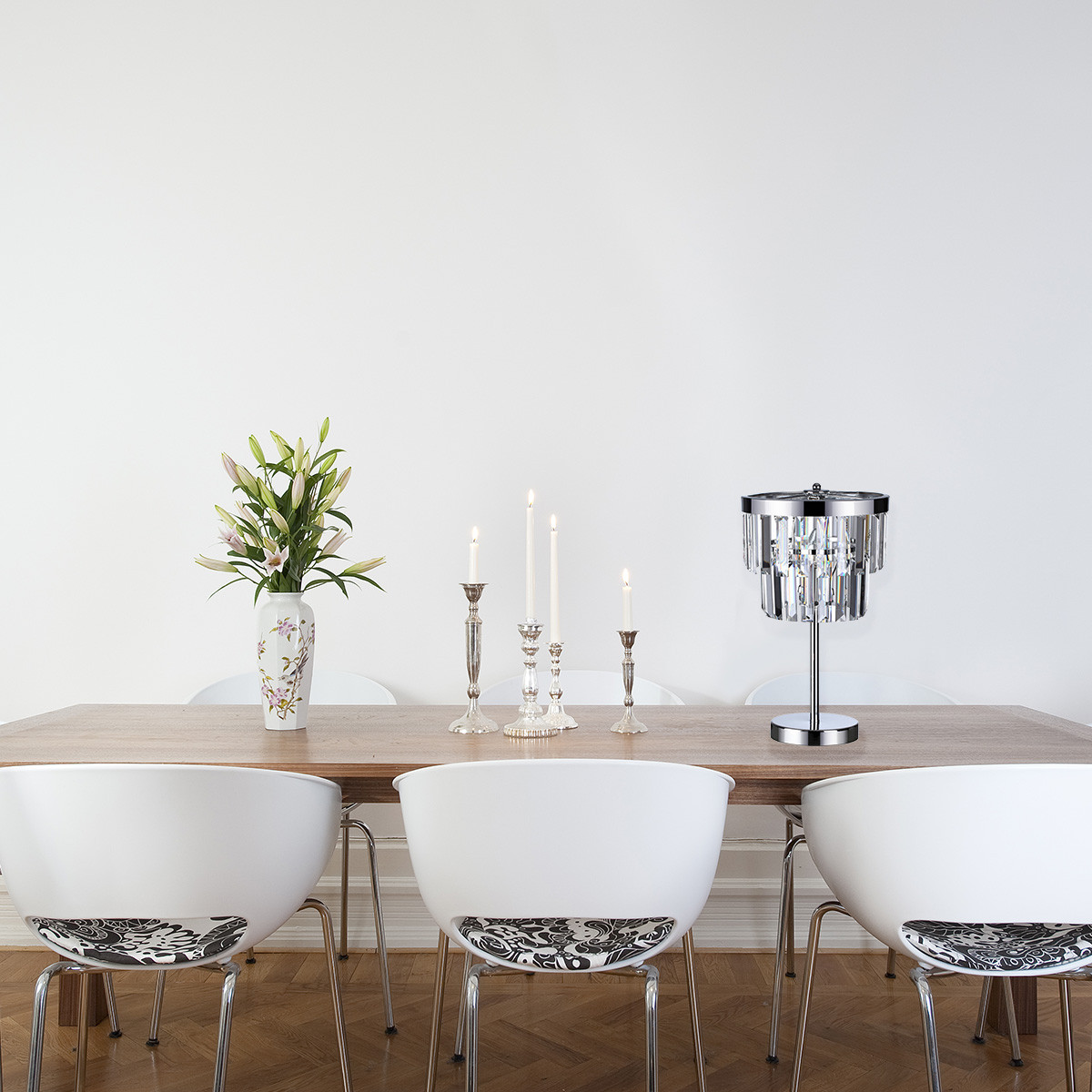 Lampa stołowa z serii Vetro to wyrafinowane połączenie metalowej konstrukcji w srebrnym kolorze z transparentnym szkłem o efektownym wykończeniu. Jej kształt i materiały czynią ją doskonałym wyborem do pomieszczeń urządzonych w stylu glamour.