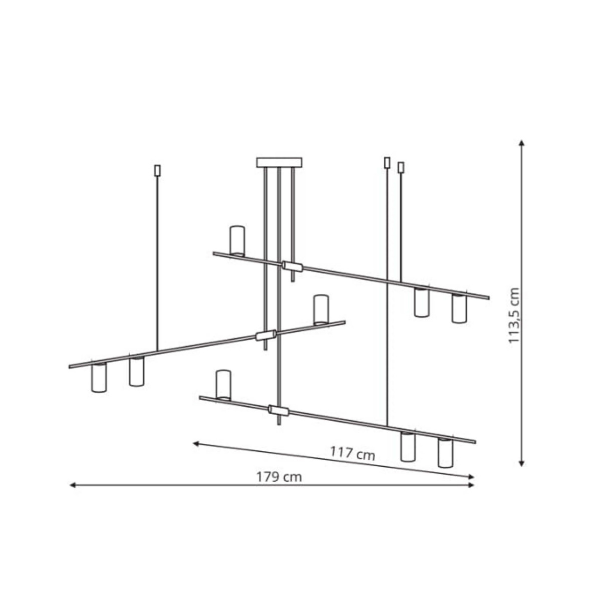 Wymiary: Lampa posiada sporą wysokość 113,5 cm oraz szerokość 179 cm, co czyni ją sporej wielkości elementem oświetleniowym, które może stanowić centralny punkt w salonie, jadalni, czy sypialni.