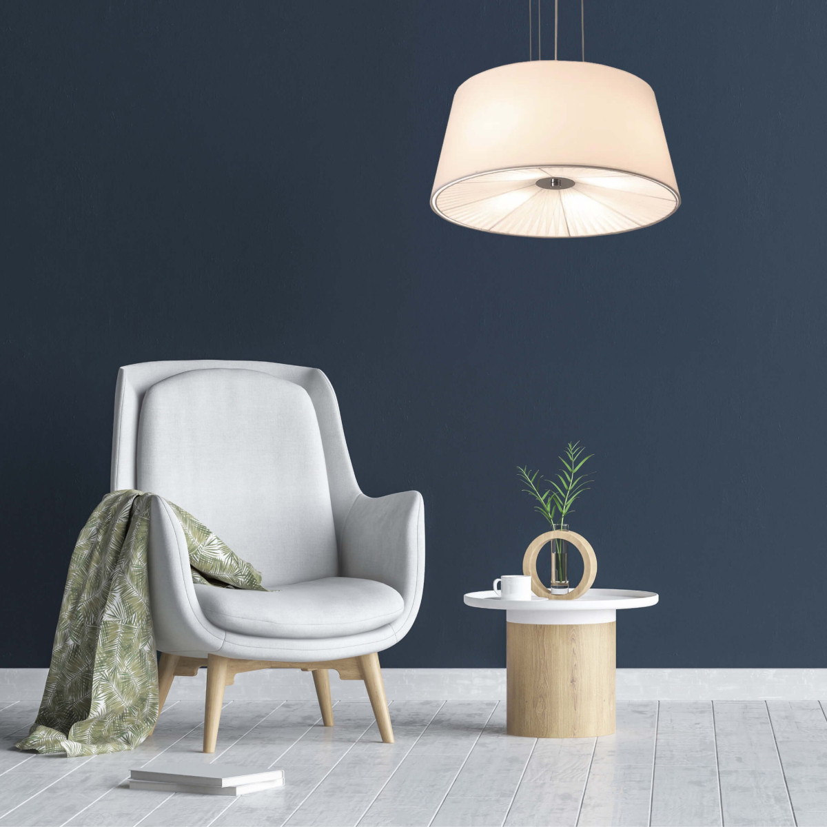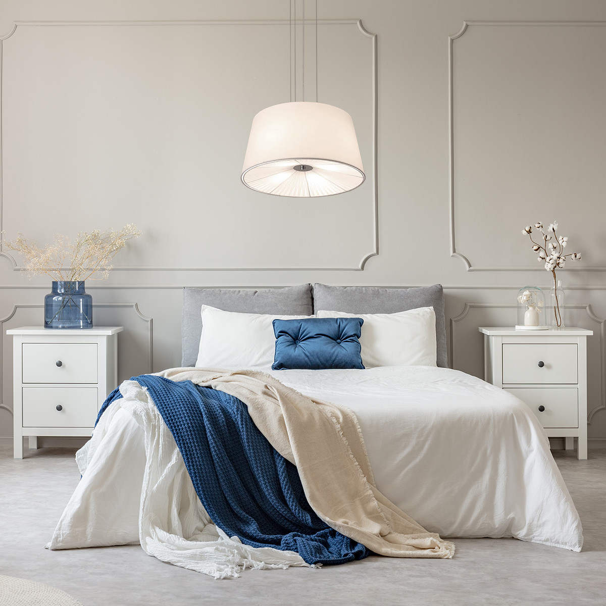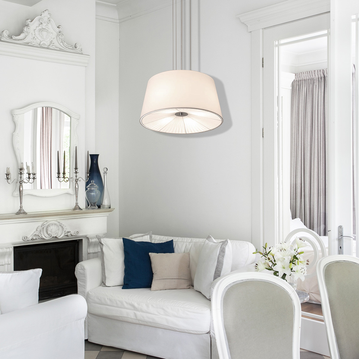 Biała lampa wisząca Bali to ponadczasowy, klasyczny model lampy z kloszem wykonanym z tkaniny.