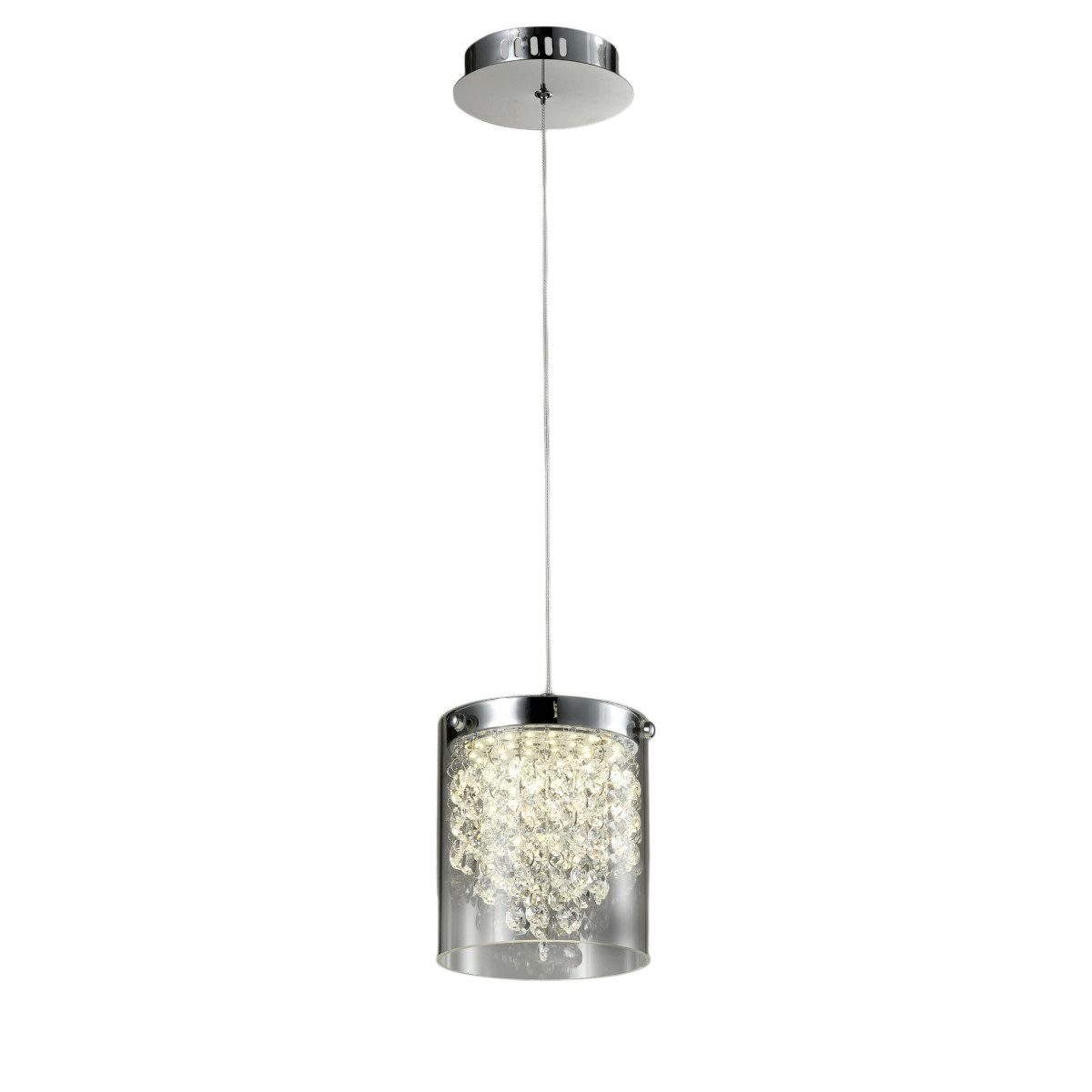 Srebrna lampa wisząca Cantos 1 to propozycja dla osób ceniących sobie piękno i elegancję w aranżacji wnętrz. Lampa Cantos 1 posiada transparentny, szklany klosz w kształcie otwartego walca, który nadaje jej nowoczesnego charakteru. Wewnątrz klosza mienią się subtelne kryształki, które nie tylko podnoszą walory estetyczne lampy, ale także tworzą wspaniały efekt świetlny. Cantos 1 wyposażona jest w jedno źródło światła LED o neutralnej barwie, co zapewnia jasne i przyjemne oświetlenie. Ta lampa będzie doskonałą dekoracją zarówno do salonu, pokoju, sypialni, jak i jadalni, dodając wnętrzom wyjątkowego uroku i klasy.