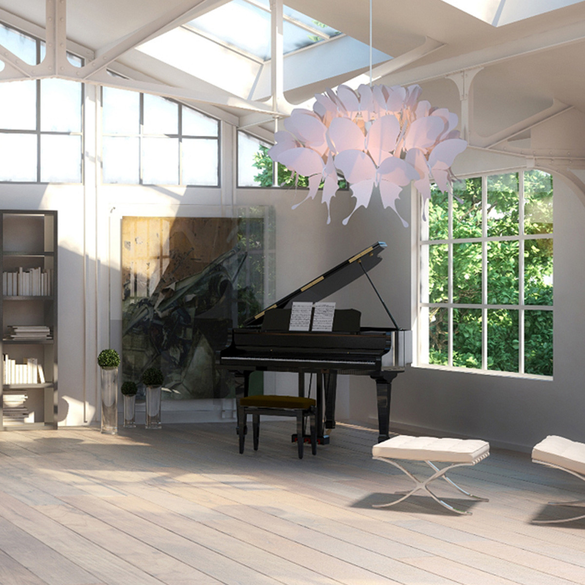 Lampa Farfalla, ozdobiona mnóstwem akrylowych motylków w delikatnym różowym kolorze, to źródło światła, ale także nietuzinkowy element upiększający wnętrze, zwłaszcza urządzone w stylu minimalistycznym czy boho. Klosz jest przestronny, a zarazem oddaje delikatne, przyjemne i rozproszone światło, dlatego sprawdzi się jako różowa lampa nowoczesna do salonu.