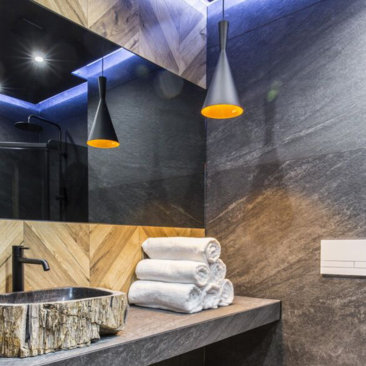 Materiał i kolorystyka: Klosz lampy został wykonany z czarnego metalu. Wnętrze klosza pokryte jest kontrastującą, złotą farbą.