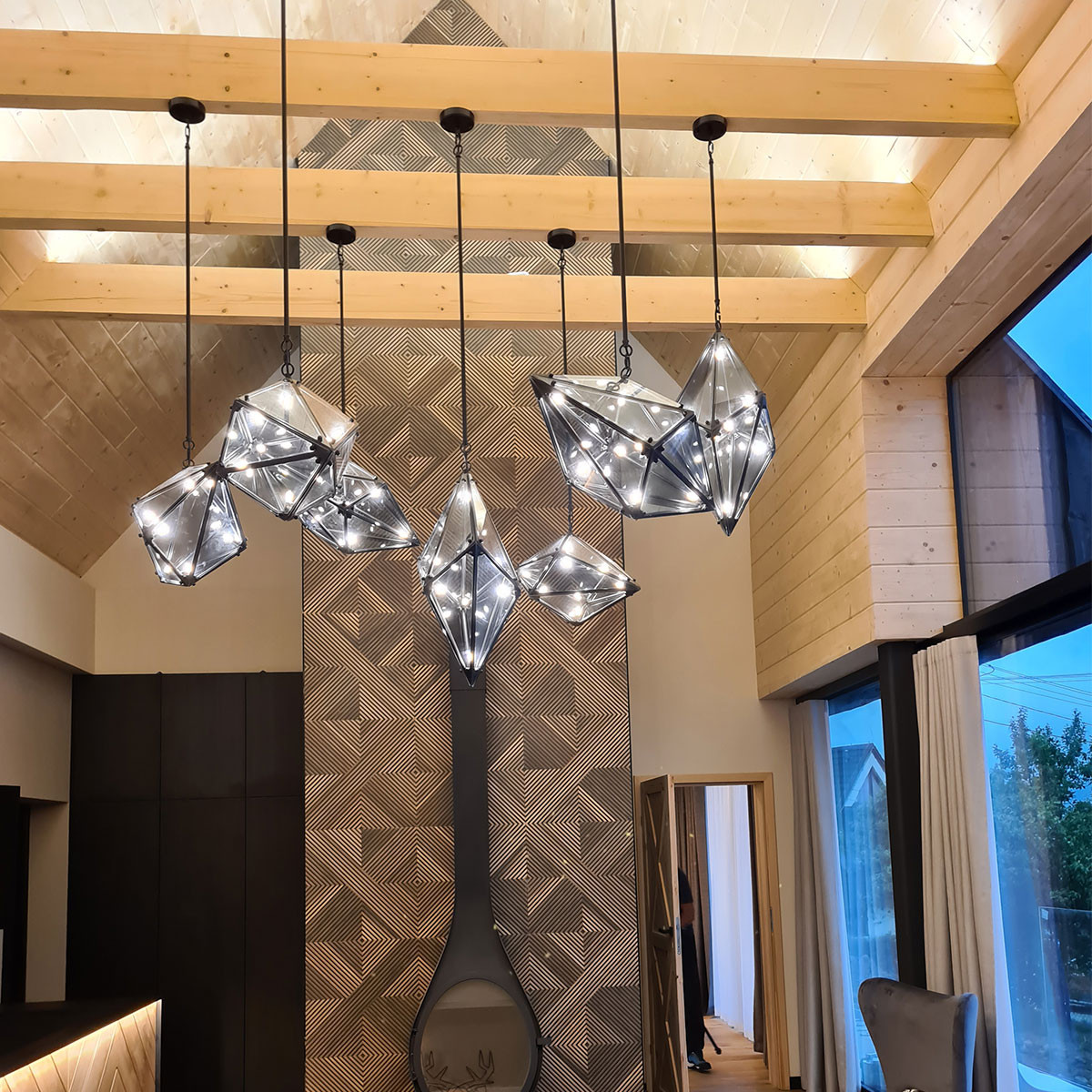 Konstelacja pionowa to elegancka lampa wisząca, która łączy w sobie nowoczesny design z funkcjonalnością. Jej asymetryczny kształt doskonale wpisuje się w aktualne trendy aranżacyjne, idealnie pasując do sufitów o nietypowych formach. Czarny, przydymiony kolor Konstelacji pionowej sprawia, że jest ona uniwersalnym dodatkiem do wielu aranżacji. Lampa nie tylko oświetla przestrzeń, ale także dodaje jej wyjątkowego uroku. Zestawiając Konstelację poziomą z Konstelacją pionową, możesz stworzyć efektowny zestaw, który z pewnością przyciągnie wzrok i podkreśli charakter wnętrza.
