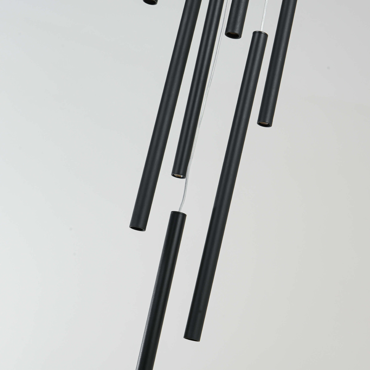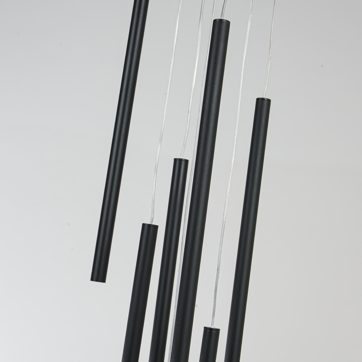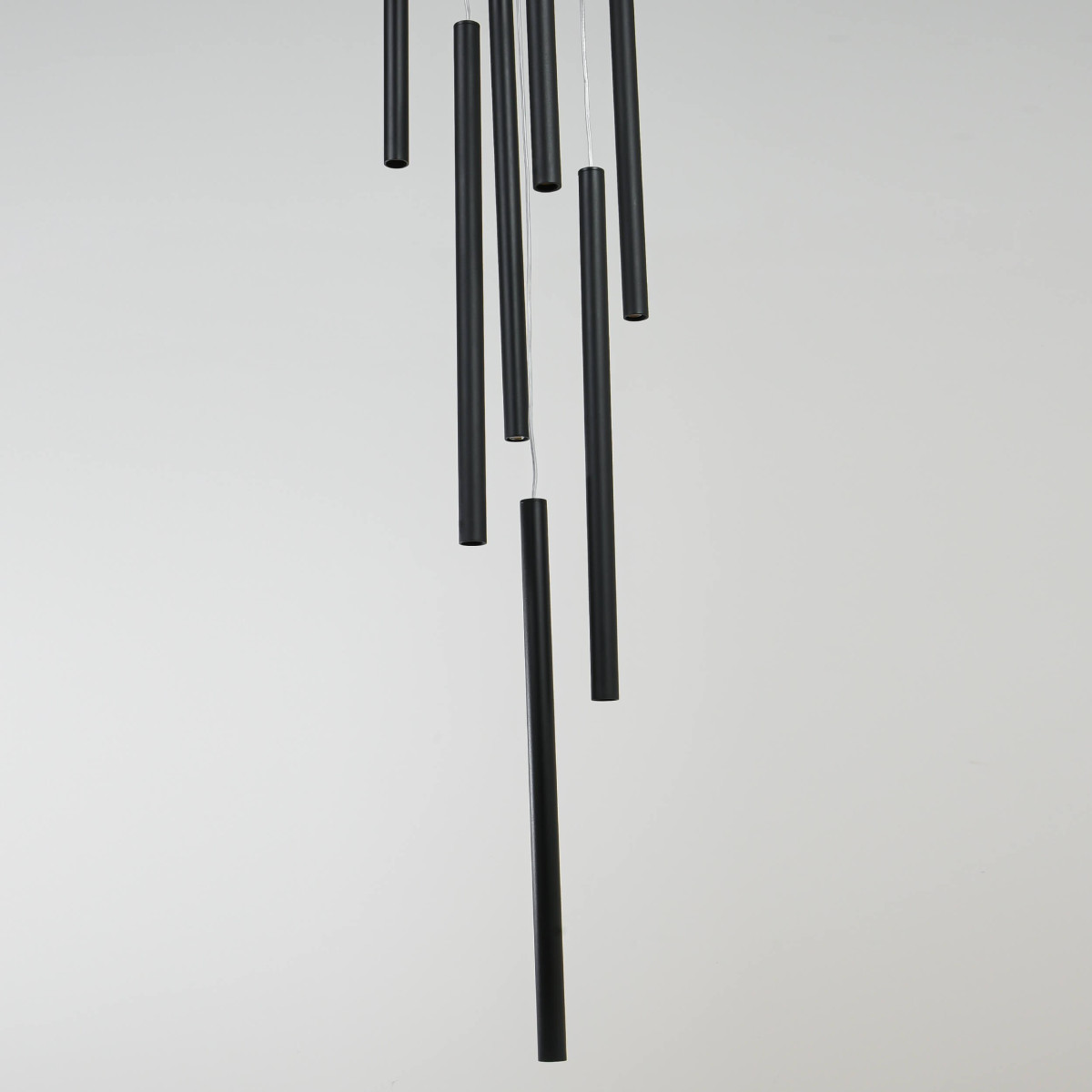Czarna lampa wisząca Lungo 7 to wyjątkowa propozycja oświetleniowa o nietypowym wyglądzie kloszy i imponującej długości. Lampa ta posiada siedem kloszy w kształcie długich, wąskich tub, na końcu których znajduje się miejsce na żarowkę o gwincie G9. Tuby zostały wykonane z czarnego metalu i są umieszczone na różnych wysokościach.