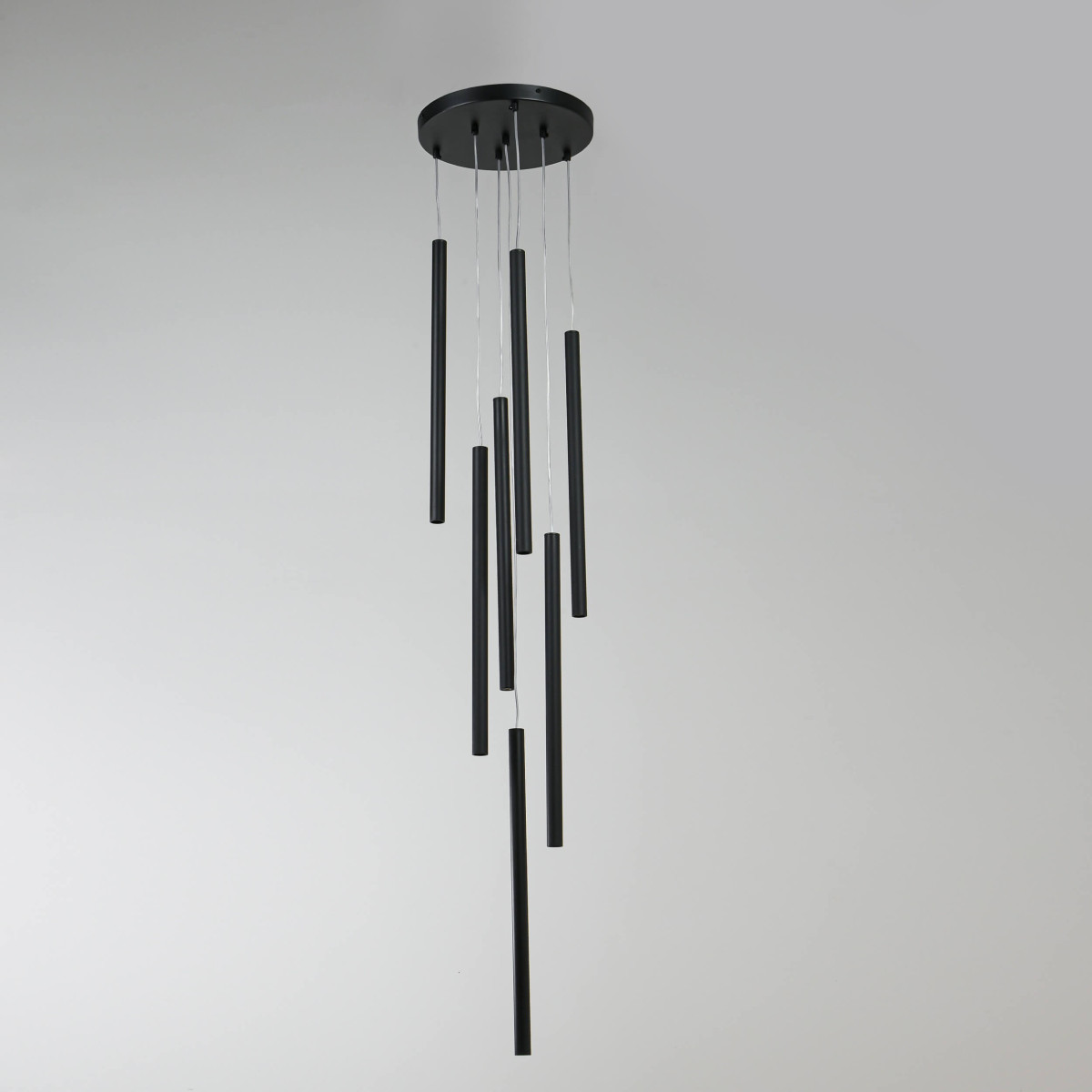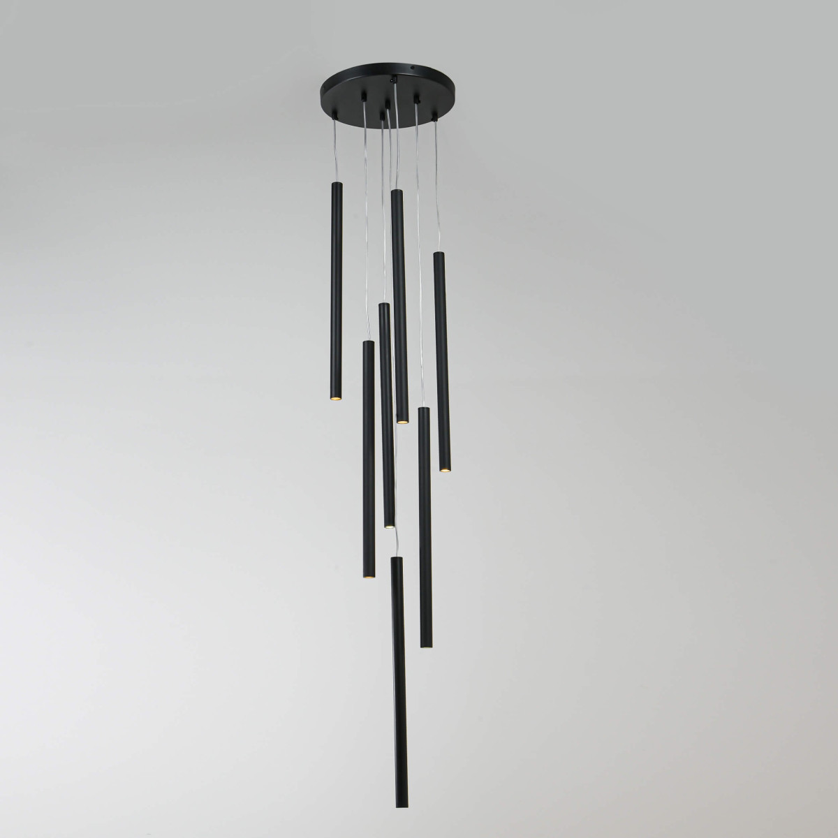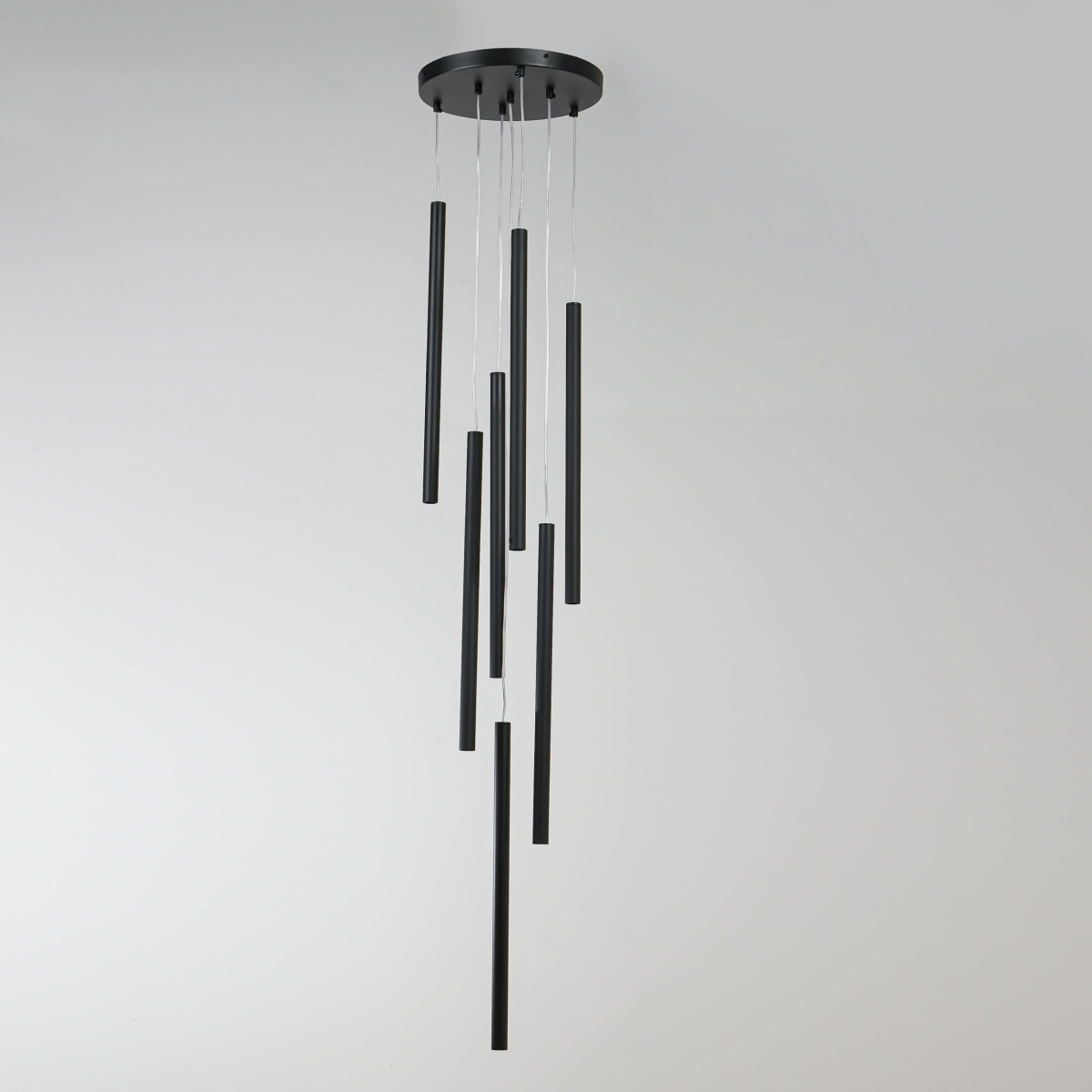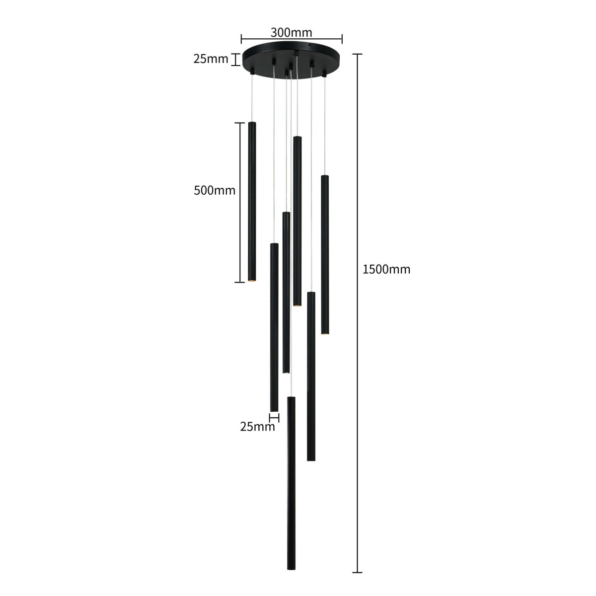 Czarna lampa wisząca Lungo 7 to wyjątkowa propozycja oświetleniowa o nietypowym wyglądzie kloszy i imponującej długości. Lampa ta posiada siedem kloszy w kształcie długich, wąskich tub, na końcu których znajduje się miejsce na żarowkę o gwincie G9. Tuby zostały wykonane z czarnego metalu i są umieszczone na różnych wysokościach.