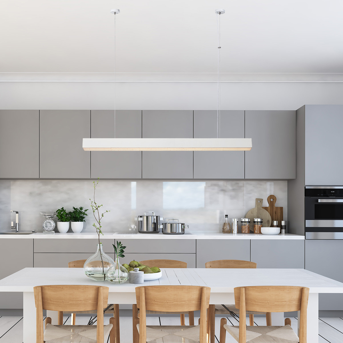 Lampa Mira L LED CCT łączy w sobie nowoczesny design z zaawansowaną technologią. Wykonana jest z trwałego aluminium w białym kolorze, co nadaje jej nowoczesny i elegancki wygląd. Kształt podłużnego prostopadłościanu oraz unikalna blenda z wzorem plastrów miodu sprawiają, że lampa stanowi nie tylko źródło światła, ale również interesujący element dekoracyjny. Lampa zawieszana jest na regulowanych linkach, których maksymalna długość wynosi 120 cm, umożliwiając dostosowanie wysokości do indywidualnych potrzeb. Technologia LED CCT pozwala na regulację barwy światła, dzięki czemu można dopasować oświetlenie do każdej sytuacji i nastroju. Lampa oferuje możliwość sterowania za pomocą aplikacji Tuya Smart, co umożliwia łatwe i wygodne zarządzanie oświetleniem z dowolnego miejsca w domu. Posiada klasę ochronności IP20, co oznacza, że jest chroniona przed dostaniem się wewnątrz lampy obiektów o średnicy równej bądź większej niż 12 mm. Mira L LED CCT to idealne rozwiązanie dla osób ceniących nowoczesne technologie i prosty design. Mira LED CCT to idealne rozwiązanie zarówno do przestrzeni domowych, jak i komercyjnych.