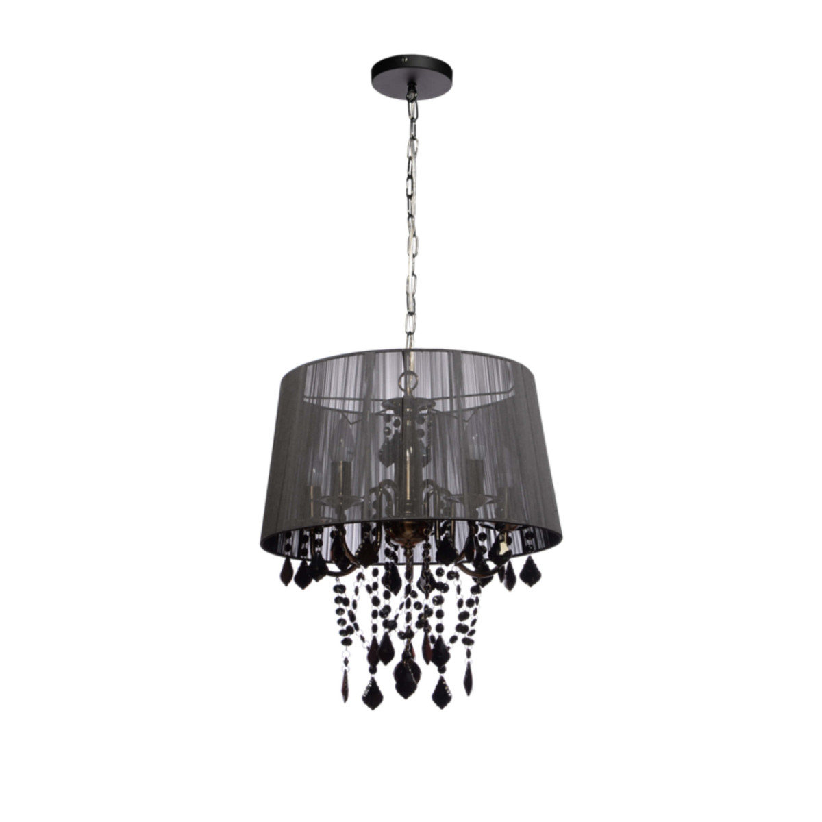 Czarna lampa wisząca Mona to luksusowy element oświetlenia, który stanowi podstawę całej kolekcji Mona. Lampa jest wykonana z metalu w czarnym kolorze oraz czarnego, tkaninowego klosza. Wzbogacona jest o zdobienia z kryształków z czarnego szkła. Wyjątkowy design, wykończenie, kolorystyka oraz użyte materiały sprawiają, że lampy z kolekcji Mona są idealnym dopełnieniem wnętrz w stylu glamour, hotelowym oraz nowojorskim. Lampa wisząca Mona wyposażona jest w pięć gniazd na żarówki o gwincie E14. Materiałowy klosz miękko rozprasza światło, a kryształki efektownie mienią się i odbijają jego blask.