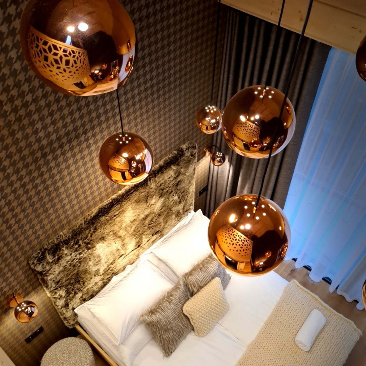 Rame 1 lampa wisząca mała to nowoczesna lampa, która łączy funkcję oświetlenia i stylowej dekoracji. Zamontowana na eleganckiej podsufitce i długim przewodzie, zakończona jest kloszem w formie otwartej kuli o średnicy 15 cm. Miedziane wykończenie sprawia, że idealnie wkomponuje się w surowe, ceglane wnętrza lub ciemne aranżacje. Lampa jest przystosowana do żarówki z gwintem E14. Lustrzana powierzchnia klosza dodaje pomieszczeniu nowoczesnego charakteru i głębi.