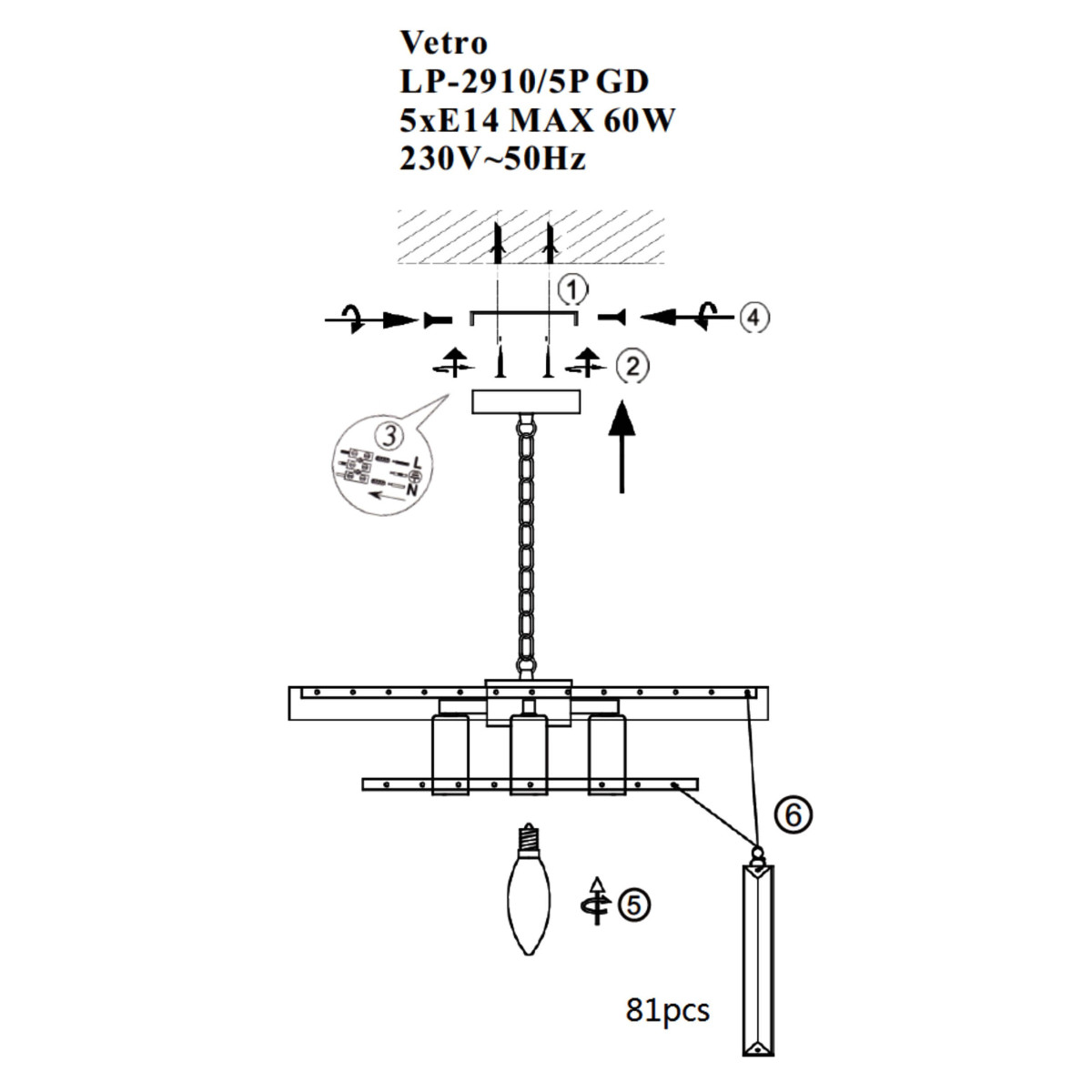 Źródło światła: Lampa jest kompatybilna z żarówkami o gwincie E14 z przeznaczeniem na pięć żarówek.