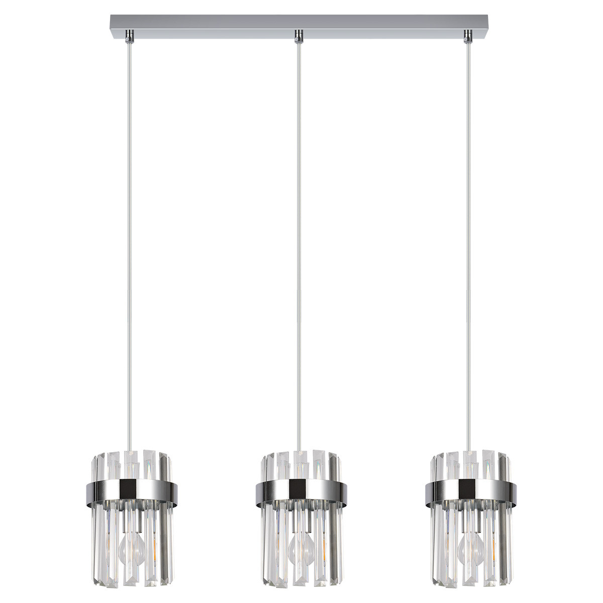 Srebrna lampa wisząca z kolekcji Vetro to połączenie elegancji i prostoty w nowoczesnym wydaniu. Podsufitka została wykonana z metalu w kolorze chromu, a klosze z transparentnego szkła. Przezroczyste elementy efektownie rozpraszają światło, tworząc przyjemną atmosferę we wnętrzu. Model przeznaczony jest do żarówek z gwintem E14. Lampa doskonale sprawdzi się nad stołem, wyspą kuchenną lub w innych strefach, gdzie liczy się zarówno funkcjonalność, jak i estetyka.