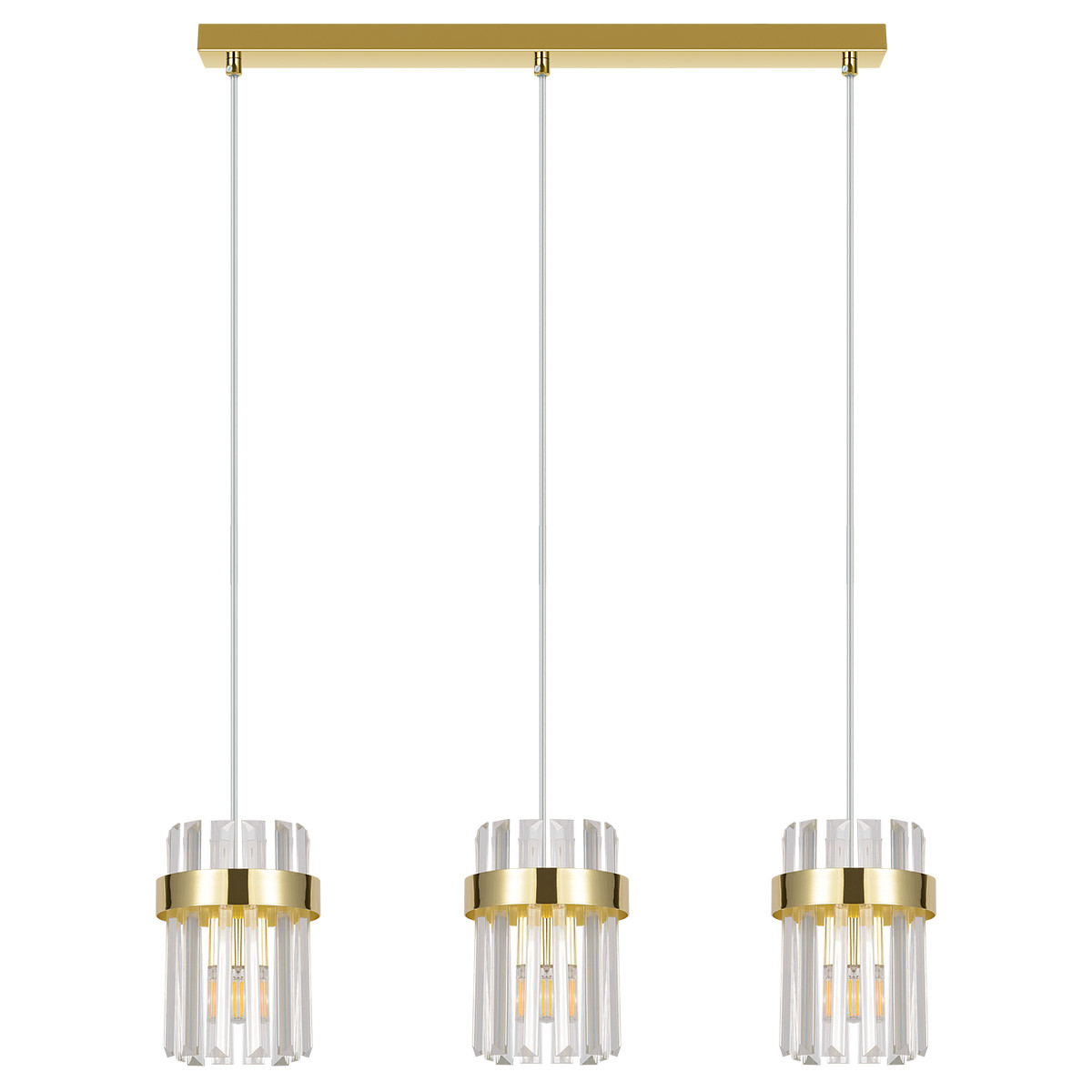 Złota lampa wisząca z kolekcji Vetro to połączenie elegancji i prostoty w nowoczesnym wydaniu. Podsufitka została wykonana z metalu w kolorze złota, a klosze z transparentnego szkła. Przezroczyste elementy efektownie rozpraszają światło, tworząc przyjemną atmosferę we wnętrzu. Model przeznaczony jest do żarówek z gwintem E14. Lampa doskonale sprawdzi się nad stołem, wyspą kuchenną lub w innych strefach, gdzie liczy się zarówno funkcjonalność, jak i estetyka.