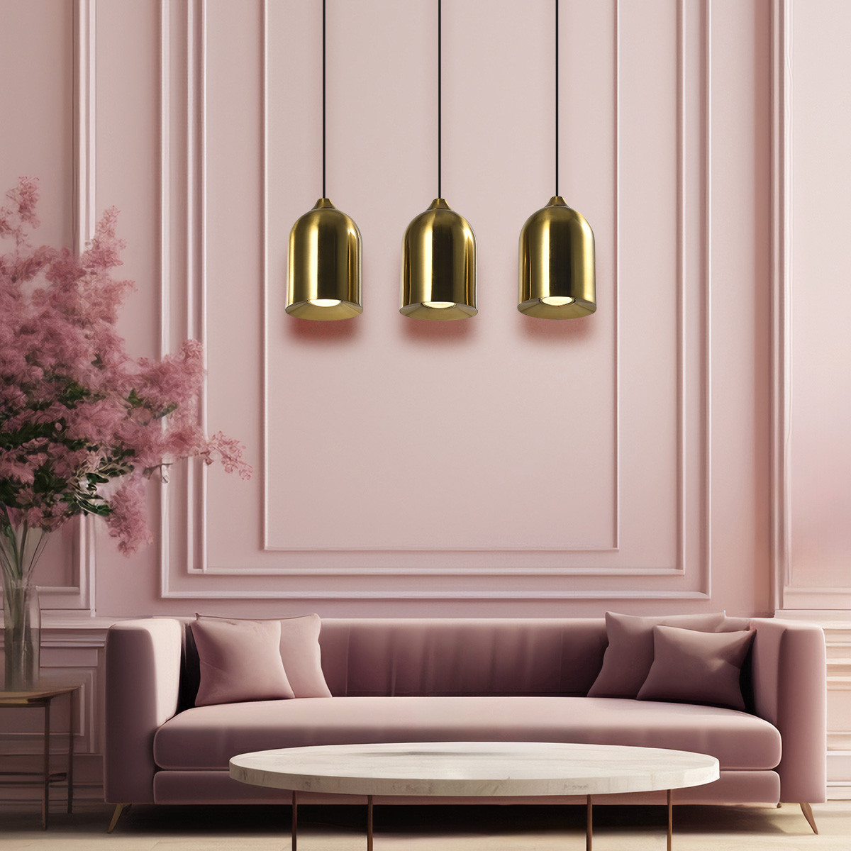 Potrójna metalowa lampa wisząca Nilo to nowoczesne oświetlenie, które zachwyca minimalistycznym designem i wysoką jakością wykonania. W całości wykonana z metalu, ze złotymi kloszami i czarną podsufitką, doskonale komponuje się z nowoczesnymi, eleganckimi wnętrzami. Dzięki szerokiej podstawie montażowej idealnie sprawdzi się nad długim stołem w jadalni, wyspą kuchenną czy ladą w restauracji lub kawiarni. Lampa Nilo to stylowy element dekoracyjny, który wnosi elegancję i charakter do każdego wnętrza.