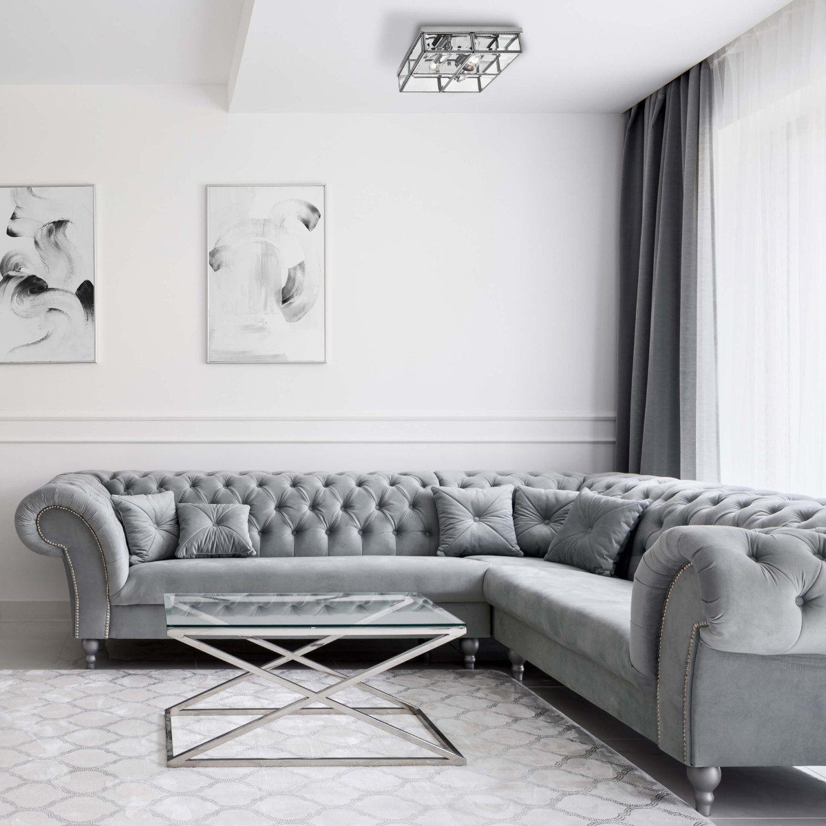 Duet w postaci szkła i posrebrzanego metalu, jakim odznacza się ten plafon sufitowy kwadratowy, to jeden z najbardziej typowych wyznaczników stylu glamour. To w nim lampa będzie zatem prezentować się najkorzystniej. Możesz jednak uczynić z niego dekorację każdego wnętrza, w którym znajdują się detale w kolorze chromowanego metalu.