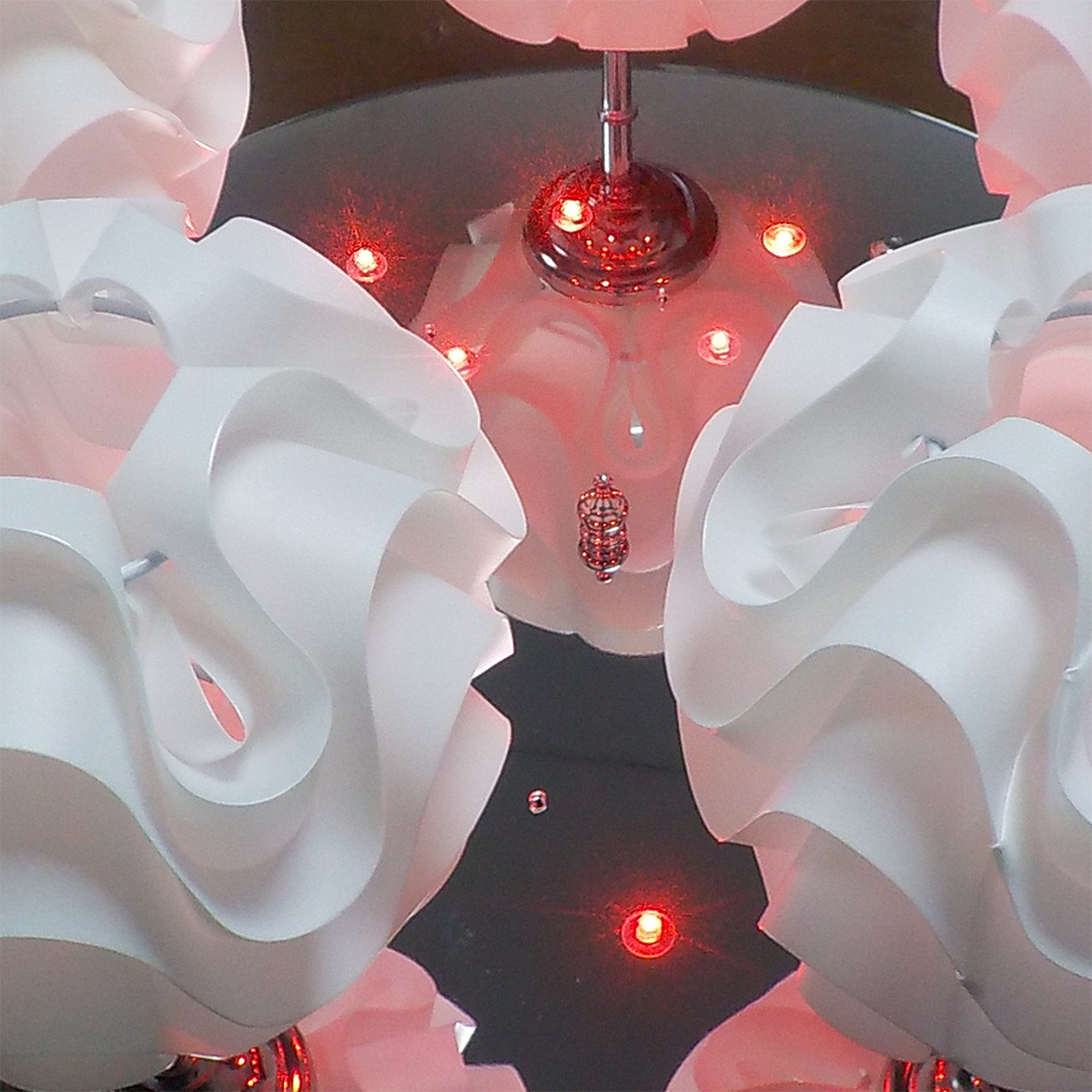 Źródło światła: Plafon z kolekcji Sada posiada dwa źródła śwatła. Pierwszym jest pięć żarówek o typowym gwincie E14 (żarówek nie ma w zestawie), natomiast drugim jest wbudowane światło LED o zmiennej barwie światła w kolorach: czerwieni, fioletu i niebieskiego. Lampa posiada w zestawie pilota, za pomocą którego można zmieniać barwę światła LED.