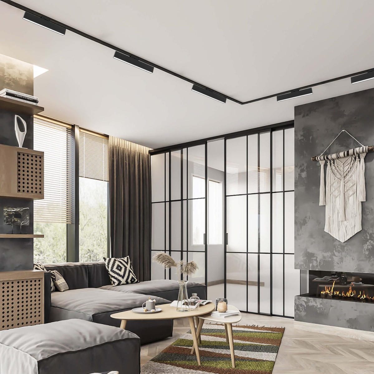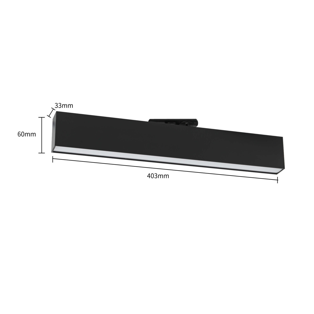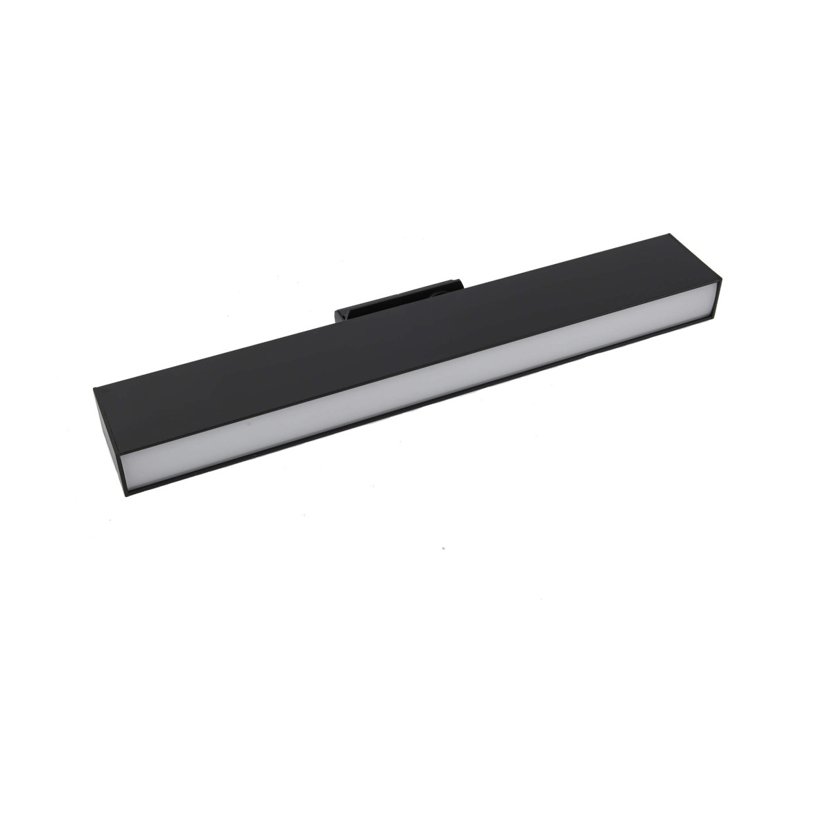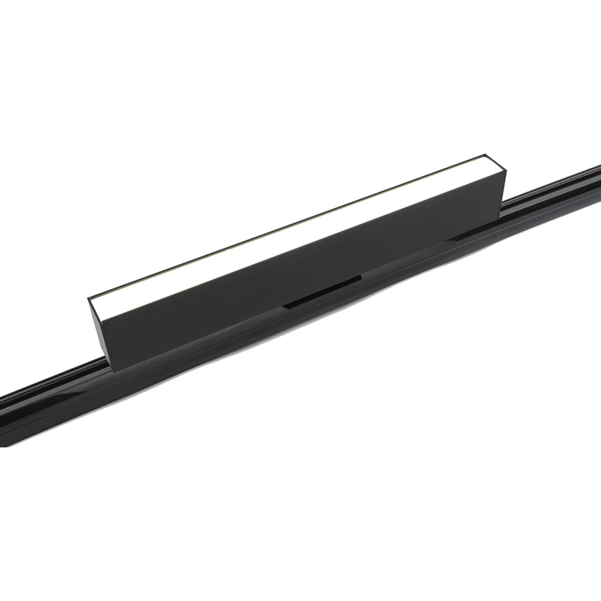 Czarny reflektor do szynoprzewodów. Reflektor posiada 40 cm długości i 4 cm wysokości. Posiada wbudowane, źródło światła LED o neutralnej barwie 4000K. Przeznaczony jest do szynoprzewodów jednofazowych (1F).