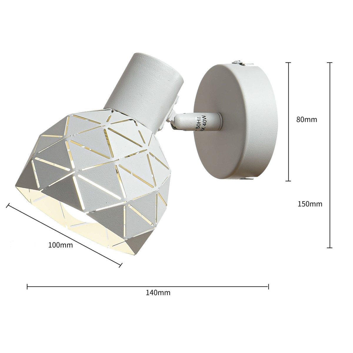 Wymiary: Spot posiada wysokość 15 cm, średnica klosza wynosi 10 cm, głębokość całej lampy 14 cm.